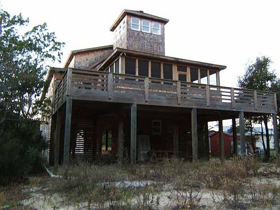 Nags Head style home, with large wrap around porch. Great location with views of ocean, sound and Jockey's Ridge. Custom wood and tile work through out this home. Very unique open floor plan with lots of wood. Room to park at least four cars or boat under the home with dry entry. Home being sold in "as is " condition.