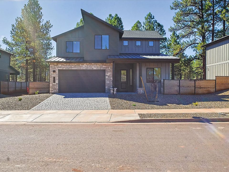Enjoy the cool evenings and crisp, clean air in your beautiful home nestled among the pine trees with endless views at Timber Sky. This 2,488 sq. ft. home features 4 bedrooms, a study, and 4 bathrooms, all designed with an open great room layout that includes a cozy fireplace for winter nights. The split floor plan boasts a primary suite, laundry area, and study on the main level, with the secondary bedrooms located upstairs. The home is finished in neutral-toned luxury vinyl and carpet in all the right places, complemented by stone color shaker cabinets, brushed nickel hardware, elegant quartz countertops, and stylish tile shower surrounds. Washer, dryer, and refrigerator included! As an added bonus, all Capstone Homes at Timber Sky Adora come equipped with spray foam insulation, are pre-wired for solar energy, and include a 220V electric car plug in the garage. This home is conveniently located close to downtown Flagstaff, NAU, CCC, and the FUTS trail, offering access to all the beauty Flagstaff has to offer!