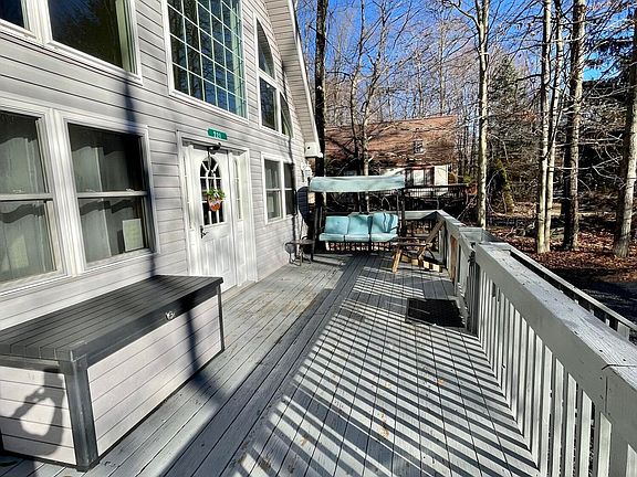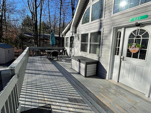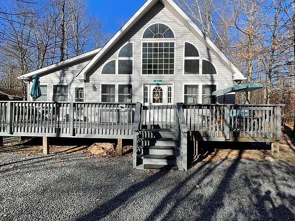 FULLY FURNISHED Contemporary Chalet available in the gated, AMENITY-FILLED community of Arrowhead Lake! WALK TO THE POOL! YOU CAN'T BEAT THE LOCATION! CENTRAL AIR AND HEAT! There are 4 Spacious Bedrooms, 2 full Bathrooms. Home is updated with Granite, Stainless Steel appliances and Laminate floors! Bright and Sunny SUNROOM off of Kitchen that could be a GAME room or FLEX room. Outside features have plenty of parking with horseshoe driveway, HOT TUB, and FIREPIT! GREAT RENTAL HISTORY!! TURNKEY!!!! Fully equipped with surveillance system. Home is close to Pocono area attractions, hiking, skiing, casinos, water parks, outlet shopping. Community features 3 outdoor pools, 2 lakes, 4 beaches, gym, playgrounds, tennis. DONT MISS THIS ONE!!