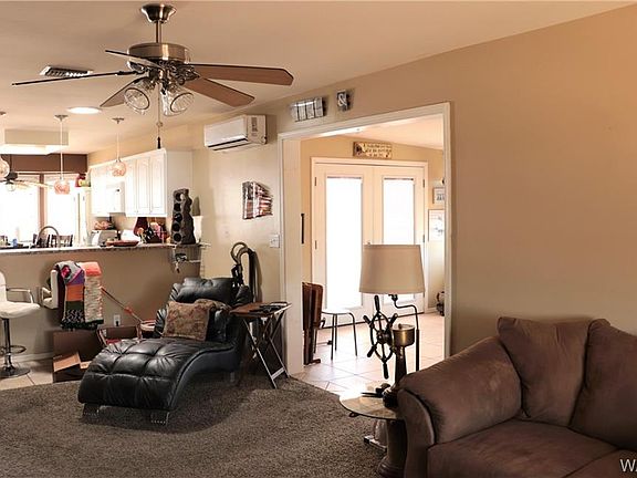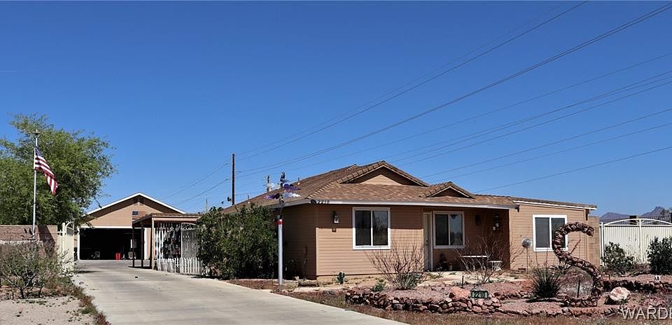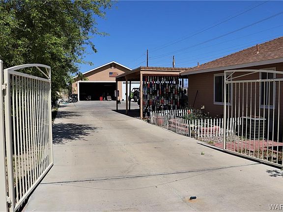 Ft. Mohave Home 3 bedroom home with desert access. This home has a secure electric gate entry leading to a fun sized garage and roomy parking area. The home can be accessed from 3 different sides. The island kitchen features a breakfast bar and dining area. The living has a sunroom leading to an outdoor patio. The bedrooms are split for privacy. The master bedroom has a custom barn door entry. The property is fully fenced and features a separate double gate for easy RV/Boat access. The concrete driveway leads to the oversized detached 3 car garage and Man Cave. Wide open views to the east and an end of the street location make this home unique in every way. Call to see it today!