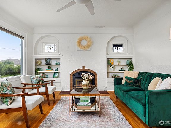 Character home situated on a corner lot in the popular Columbia Neighborhood offering delightful 2nd story views of Bellingham Bay. The interior showcases vintage charm with oak wood floors, coved ceilings, original French doors, built-ins, and a cozy wood-burning fireplace flanked by stained glass windows and bookcases. The second story features a spacious primary suite complete with a kitchenette and access to a generous deck perfect for enjoying the stunning Bay views as well as a full bath and second bedroom option. Fresh Paint throughout the interior. Lower level has potential for an additional office, family room or storage and has access to the back yard that is a blank slate and has a wood shed and large gate for access.