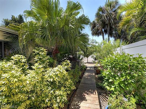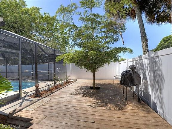 Secluded tropical oasis in The Villas. Excellent location just off of 41 close to everything. This bright and cheery home is very well loved and maintained. The master bedroom has a nice size walk-in closet and a secondary air conditioning unit so you can be a little cooler if desired. The third bedroom has a brand new Murphy bed and a desk unit installed. This would make an excellent office space, or if you wish, a third bedroom that leads out to the spacious outdoor living area and sparkling pool. The grounds are filled with abundant trees, blooming flowers, tropical and native plants. Boardwalks and decks flow throughout the gardens. The property is surrounded by a privacy fence that makes this a great place to entertain or just enjoy the serene natural beauty. This house has a unique layout with 2 sitting rooms, a perfect family floor plan. The home is freshly painted, clean and ready to go with a brand new roof.