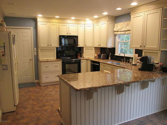 HUGE PRICE REDUCTION!!*YOU'LL NEVER FIND ANOTHER BEAUTIFUL HOUSE LIKE THIS AT THIS AMAZING PRICE*** A very spacious 4 bedroom/2.5 bath Cape Cod home with a partially finished walkout lower level. Over 2700sqft of finished living space & a big 1.41 ACRE treed and cleared park like setting lot make this home a must see. A long covered front porch welcomes you to step inside to an open Family room with a big stone wood burning fireplace & beautiful cherry hardwood plank flooring. The completely updated and renovated kitchen (at a cost of over $50,000) features beautiful CraftMade custom cabinetry, pantry, granite counters, stainless steel appliances (except refrig) and dura-ceramic tile flooring throughout that extends into the laundry room. The sunny windowed laundry room is just off th kitchen and has a laundry tub too. A full glass door off the kitchen invites you out to the big deck that overlooks the fenced lawn and creek below and big private treed yard beyond. Down the short hallway is a powder room and a spacious 1st floor master suite with walk-in closet and elegant master bath with jetted soaker tub, private water closet and step-in shower. Upstairs are 2 spacious bedrooms with windowed dormers and a full bath. One of the bedrooms is supersized and has a large walk-in closet. Step downstairs to the finished lower level with a sunny game/media room which walks out to a private patio and fenced back yard. A 4th bedroom is currently used as an office and has beautiful dura-ceramic floors. An added bonus in this home is the fabulous workshop with built-in wall racks and lots of outlets for power equipment. Other updates include engineered cherry hardwood flooring, a new roof in 2014, HVAC (Lennox high efficiency) in 2012, and no maintenance fencing. The low maintenance exterior and low utility bills ($243/gas & elec and $28/water) and a one year supreme home warranty along with award winning Oldham County schools (Centerfield Elem, OCMS & OCHS) give you great peace of mind! Only 3 minutes off I-71 Exit 18 and 10 minutes to Louisville and the Gene Snyder. CALL NOW FOR A PRIVATE SHOWING.