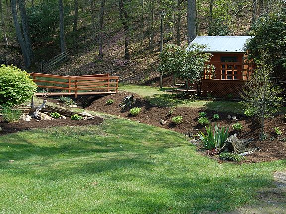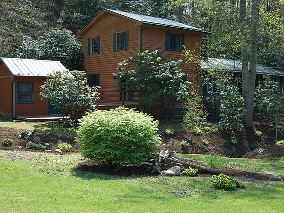 Welcome home to this three bedroom, two bath home in park like setting. Covered porch and decks for relaxing and entertaining. Foot bridges cross the branch that is right outside your front door. Stone fireplace has wood stove with blower to supplement or heat your home in the winter months, additional flue in kitchen dining area for the additional of another wood stove.