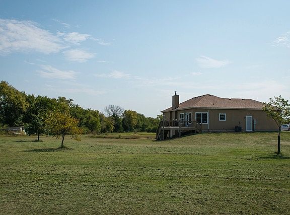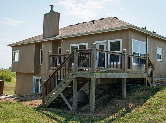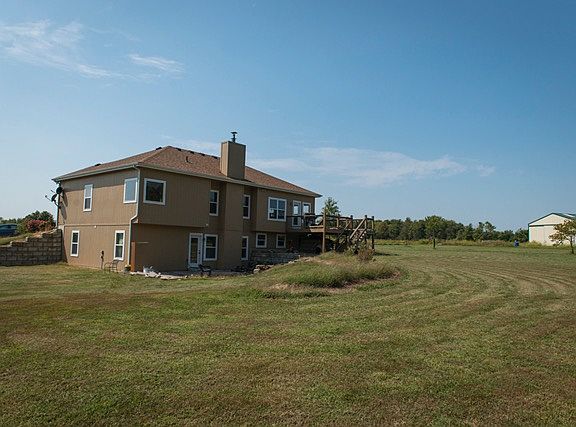 Nestled on 10 acres and a beautiful custom handicap accessible country cabin-like 3 BD 2 BA/2 Half BA reverse story and a half ranch w full mother's quarters in the walk-out basement built in 2006 (over 2800 finished total sq ft). Features include stone fireplace with insert, oversized master bed (18' x 16') and bath (17' x 16') with hot tub and dual walk-in closets, cut-out ceilings, 2 x 6 construction thru-out and laundry facilities on both levels. 30’x50’ Barn with full shelving and 12’x12’ outbuilding and a pond on black top. New roof, new carpet and new paint throughout. Contact Toni Smith@ReeceNichols.com or 913/339-6800