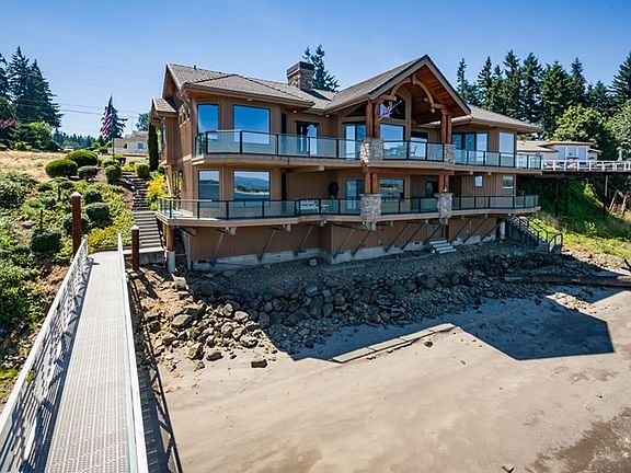 Exceptional custom built home on the Columbia River w/private dock & mountain views.Such attention to details is a must see.Master on the main w/walls of windows & access to multilevel deck.Spa like master bathroom with full walk in shower,dual closets & more.Gourmet kitchen w/walk in pantry.Formal dining,custom designed ceiling,painting, fixtures.Lower level family room including fireplace, wet bar, high ceilings.Built in sound system.Fish, boat & enjoy the river from your own private spaces!