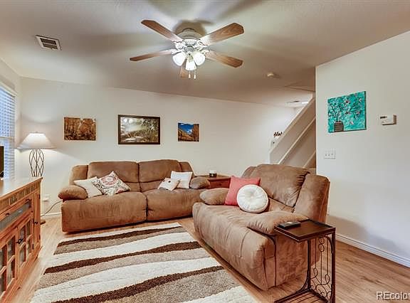 Updated, bright and spotless townhome is move in ready. Main floor has all new wood laminate flooring, all new windows throughout and blinds. Main floor has entry, living room open to dining area, access to patio with perfect sized yard, kitchen with all appliances, half bath, garage entrance. On the upper level you will find a large landing, full walk in laundry room w built ins, spacious master bedroom w nook for office/desk/reading, walk in closet & recently remodeled bath w new vanity, quartz countertop, tile floors and bath surround, new lighting. Similar remodel done on the main bath as well - beautiful updated baths, 2 additional bedrooms on the upper level. Great community, convenient to shopping, schools, parks, recreation, DIA and more.