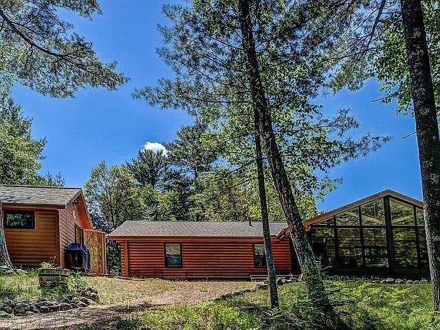 This fantastic FULL log home on 272 acre Muskellunge Lake has been meticulously maintained and is ready for new owners! This lake is known for excellent fishing and the 2.25 acre, heavily wooded lot offers privacy and 157 ft of frontage. On the main level...an open concept great room with cathedral ceiling, skylights, a beautiful Lannon stone, wood burning fireplace and a kitchen with new appliances; your 3 bedrooms & 2 full baths are also found on the main level. The FABULOUS lakeside 3 season screened porch will probably become your favorite spot; it's perfect for morning coffee or playing cards with family. The lower level offers a spacious family room with a wood stove, LOTS of storage and a laundry area. Just north of Eagle River, this is an ideal location close to lots of year-round recreation! Add to this package a fish house with electric & water, and an oversized 3 car garage with snowmobile door in back and you've got everything you need to start enjoying life up north!
