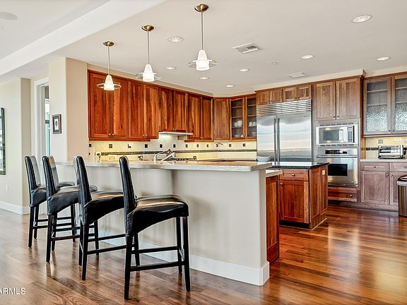 Views of Piestwa Peak from every room! Fully Remodeled Immaculate Condo at the Residences at 2211! Two primary Bedrooms and a Den/media room or 3rd bedroom. 3 bathrooms, Primary bedroom bath updated 2 yrs ago. Kithcen with Dacor appliances and stone counter top. Tile and wood flooring plus high-end carpet in bedrooms. Hunter Douglas remote control shades. Surround sound throughout, 2 parking spaces. Laundy room includes washer/dryer. Club room for entertaining up to 100. Full catering kitchen. Fully equipped gym, sauna and massage room. Roof top heated pool, fireplace, jacuzzi, 2 BBQ pits with fridge, warmers and all utensils. Rooftop party room with huge TV and seating for parties and a band. 24 hour Concierge and Valet. Available for immediate occupancy!