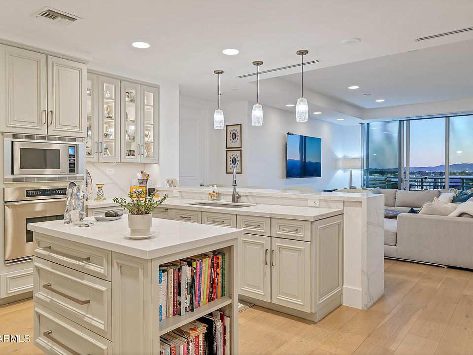 Nestled in the heart of The Residences at 2211 E Camelback Rd, this meticulously redesigned luxury high-rise residence effortlessly blends modern sophistication with coveted amenities. Boasting one of the largest patios (over 200') in the community, which flows easily to the greatroom & professional island kitchen, entertaining is effortless, overlooking breathtaking Arizona sunsets & the twinkling urban skyline to South Mountain. Gas cooktop, dual ovens, voluminous cabinetry & pantry space, all set in a serene, new neutral palette, hosting custom hardware, lighting & quartzite. Dacor, SubZero & Asco complete the dream kitchen. Adjacent large laundry easily doubles as butler's pantry & prep area. Split primary suites w unparalleled closets, flank #3 - the mirrored flex/guest/office. The primary suite is a sanctuary of indulgence, offering an expansive spa bath with a dream walk-in shower, mirrored dressing areas, and dual closets. The second suite hosts guests & provides versatility with multi-purpose closet space (even nursery opportunity), doubling for wine storage, home office, gift wrap & much more. The mirrored-wall flex room provides an ideal space for office, studio, exercise & additional guests (adjacent 3/4 powder bath). The home's captivating views create a seamless connection with the surroundings.