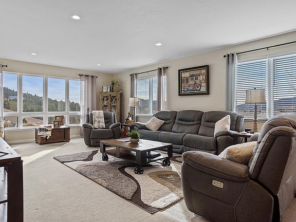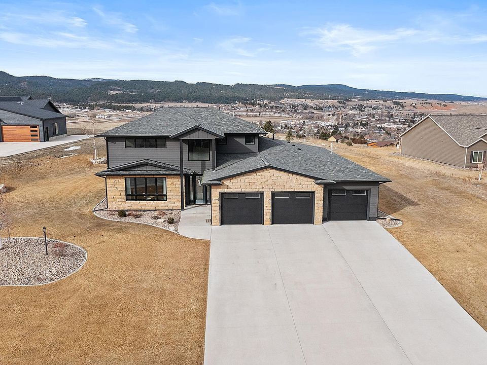 Listed by Bill Phillips, The Real Estate Center of Sturgis. 605-490-1358. Gorgeous Home on a full 1 acre lot. This beautiful 5 bed, 4 bath home offers spectacular views of the Black Hills and includes a heated and oversized 3 car garage with the third stall being 36ft deep! The main floor has everything you need with a large great room, spacious kitchen with large island, pantry, a master suite with a large master bath with tile shower and flooring, an additional bedroom, a guest bath, and a HUGE laundry room. Special features include laundry on both levels along with two heating and cooling systems. The large covered patio is perfect for entertaining and in addition to the views, the yard is equipped with a nice landscaping and a sprinkler system. So much to offer with this custom property, call today for personal showing!!