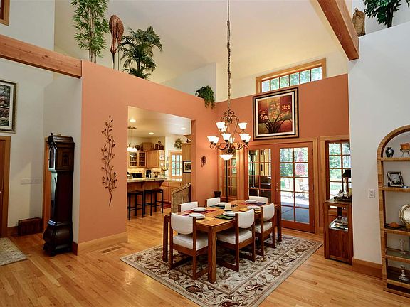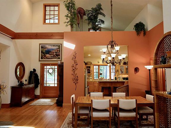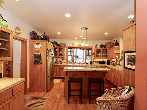 It is hard to imagine a more beautiful country home than this gorgeous one on Memeo Rd. Sitting majestically at the end of the drive, the house is on 3 + acres, and has Squaw Creek flowing at the rear of the property. The wrap around deck allows for multiple summer activities, or for big bashes. Grassy lawns surround the home, while the outer areas are wild. The extra large, heated, garage provides workshop space. There are RV hookups and parking, and there is an outdoor shower! The interior of the home is spacious, with vaulted ceilings, wood floors, skylights and an expansive, open living area. Two Master Suites are separate enough to allow for privacy. The front one has an exercise room, with TV. The kitchen has a well lit office at one end, and the small den-office off the living room would provide sleeping space for a guest. The handsome, river rock fireplace anchors the living room, while the wood stove provides plenty of heat. This home was made for entertaining, or for hiding yourself away from the world. It is simply fabulous!