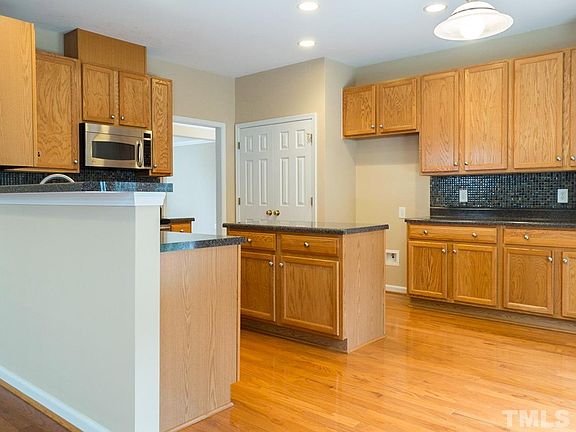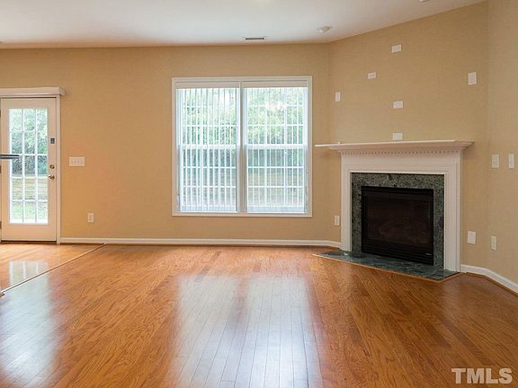 This Raleigh two-story home offers hardwood flooring, a fireplace, a kitchen island, a master bedroom walk-in closet, and a den.