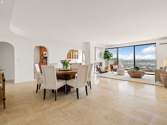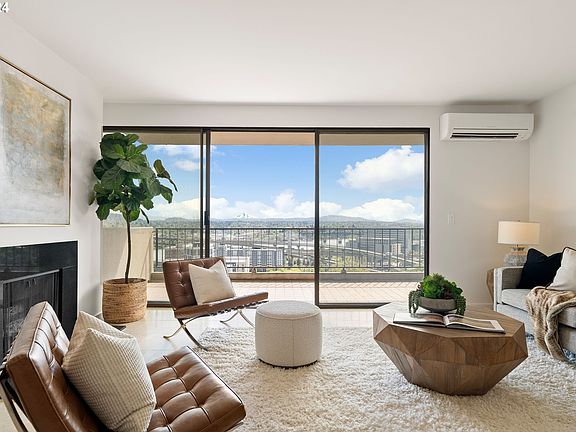Panoramic views overlooking the city, river, Mt St Helens and Mt Hood at American Plaza. Flooded with natural light and boasting with character, this home is one of a kind. A condominium that feels like a home with 3 bedrooms, elegant arch doorways, travertine tile floors, gas fireplace, and a generous great room. Highly desirable indoor outdoor living with large sliding glass doors that open to balcony showcasing views that are spectacular from sunrise to sunset, and through the night. Updated lighting, paint, and carpet - this home is bright, fresh, and move-in ready. Unmatched building amenities including 24/7 concierge, indoor salt water pool & outdoor pool, multiple saunas, gyms, party rooms & ample guest parking. Enjoy living conveniently between Downtown & South Waterfront, minutes to OHSU, Waterfront Park, shops, restaurants, Streetcar/MAX & more.