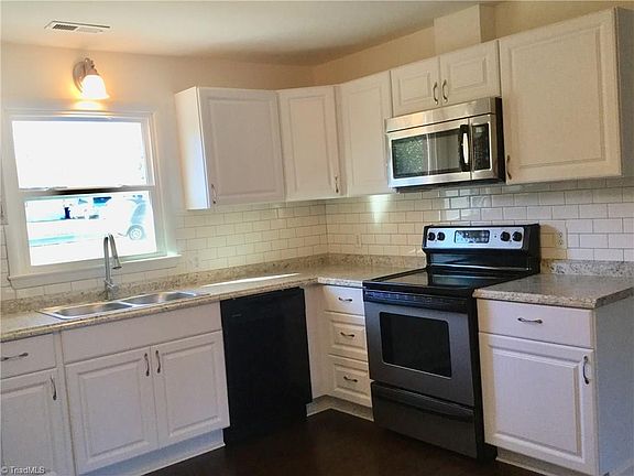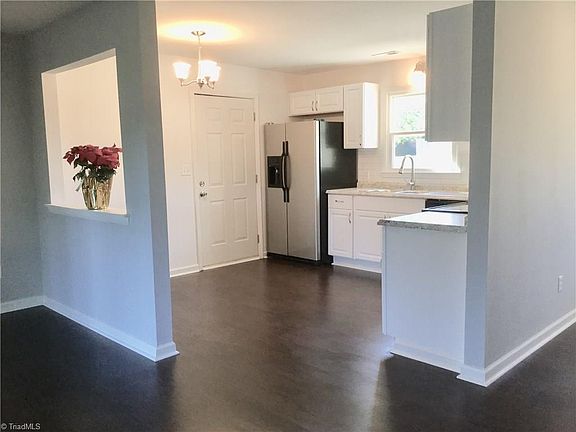 HIGHEST & BEST TODAY 1PM!!! Must see this cute 3 bdrm 1.5 ba brick ranch with a complete interior remodel! Beautiful engineered wood floors in the living space, new carpet, bath vanities, white kitchen cabinets, gorgeous counters, all appliances remain; including Stainless refrigerator in the eat-in kitchen. New energy efficient windows and French Doors that lead onto a covered porch overlooking a huge fenced yard, great for entertaining or a garden. Close to both I-40's, Winston, HP & GSO