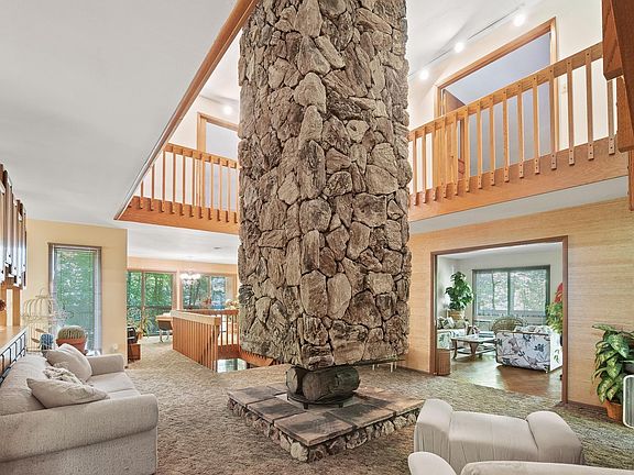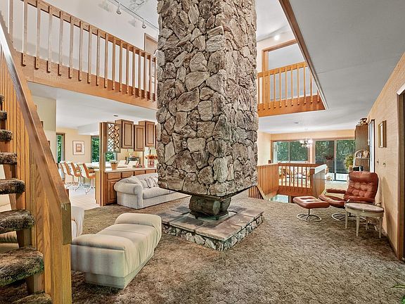 When you step into this one of a kind, one owner home built in 1979 you will be amazed. The suspended center stage fireplace dominates with the open 3rd story balcony surrounding the area. The dining space looks out onto the wooded lot. The living room with parquet flooring and large windows sits to one side of the fireplace. The kitchen offers plenty of space for cooking with the built in center eating area adding to the design. The solid wood cabinets are in wonderful condition and the staggered wall of cabinets catches the eye. All appliances are included. This home includes all of the furnishings and all items present in the home seen during your showing, (the pictures were taken before personal items were removed). All items will remain with the home. Items present in the home will not be removed by seller. This is a 3 bedroom home with the closets for the 2nd and 3rd bedrooms located in the bathroom on the same level. The master on-suite has a shelf running along the upper area for display. The bathroom off of the family room has an extra large jetted tub and sauna. The four car garage can be entered from two directions. There is a full bathroom and work room in the garage. The wooded lot requires little to no mowing. Don’t miss your opportunity to call this unique house your home. The furnace was replaced in 2020. The roof is original and will need to be replaced, (the house has been priced accordingly) and is sold AS-IS. Cash sale.