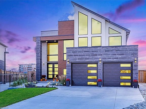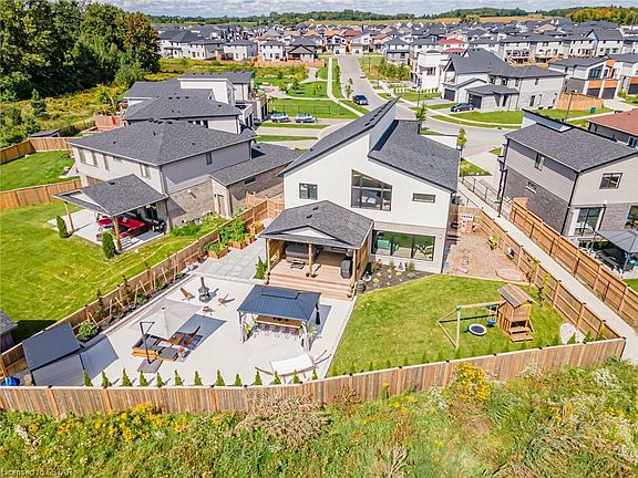 Executive showstopper in North London on massive pie-shaped lot! Stately curb appeal with deep concrete driveway and sidewalk leading to the grand entrance. Enter the expansive foyer with clear sight lines to the open concept main level featuring floor-to-ceiling windows along the length of the home. Light oak engineered hardwood through the main floor, 72 fireplace with ceramic tile surround, ample entertaining space with dining room flowing into the kitchen and backyard oasis. Professionally designed kitchen features upgraded cabinets, high grade quartz countertops with waterfall island, walk-in pantry, coffee/bar with sink, and tons of storage. With oversized windows throughout, an open riser staircase, and glass railings, natural light floods every inch of this home! Second level offers incredible views with vaulted ceilings reaching 19' in height. The loft is well utilized as an additional family room and office, but could be converted into an additional bedroom. The spacious primary suite is accessed through double doors, with vaulted ceilings, expansive windows, a walk-in closet, and spa-like ensuite with freestanding tub, oversized glass shower with transom, pebble stone floor tile and double sinks with quartz countertops. Two well-sized bedrooms, a 4pc bathroom, and a second floor laundry room complete this level. Professionally designed backyard oasis with covered deck, Jacuzzi hot tub, expansive poured concrete pad, oversized gazebo, stamped concrete landscape stones, lighting, custom veggie boxes, oversized patio stone pathway, armour stone edging, cedars along the length of the property, mulched kids play area, and still plenty of room for a pool! Unspolied basement offers additional development potential with 9' ceilings and 47x36 windows. Oversized double car garage (21'x26') is fully insulated. This home has seen many recent upgrades and must be seen to be truly appreciated, it is sure to impress! Extensive List of Updates & Inclusions available.