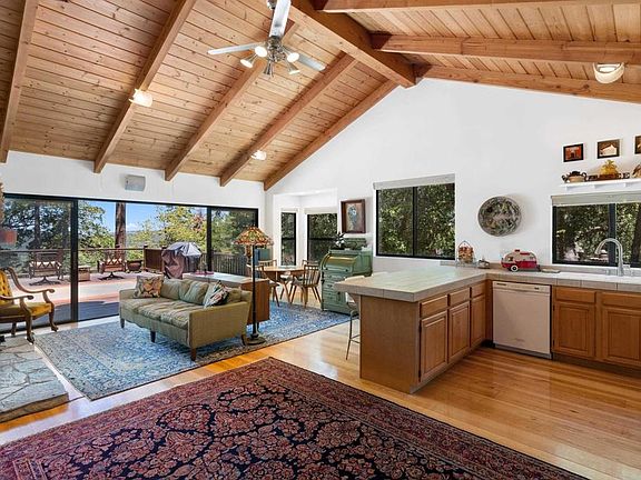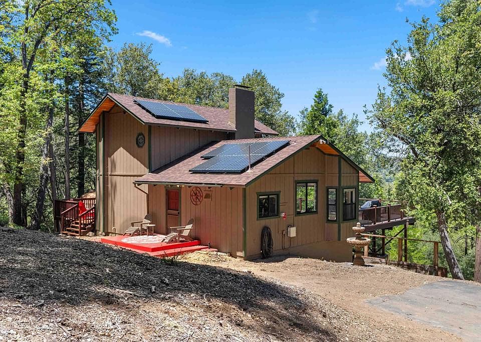 Reduce to sell quickly! Be sure to view video showing ultimate privacy with amazing views from 2288 sf custom home with 1500 sf of four fabulous decks. Escape to the sounds of nature where the chorus of birds will take your breath away. See the World Famous Observatory framed by towering cedars, oaks and firs. Step into the quality constructed custom home with all newer appliances and solar. Beam ceilings in the living and kitchen great room where you'll be tempted to leave the doors wide open to the largest deck all day long. Two sided fireplace is enjoyed also in a den that has been a nice bedroom in the past and steps out to the deck. The full bath opens to another deck looking up to the charming guest quarters in a restored, vintage trailer that will make you smile. Upstairs primary suite with private bath and balcony. Downstairs TV room, could be a fabulous master suite also, steps out to a covered patio and portable, top-of-the-line, Sun Lighten Sauna. Large laundry room/workshop plus a 12 x12 shed with a loft are waiting for your projects. Paved driveway through an acre and a half at the very end of a deeded road gives you lots of options. Some furnishings optional and ready for your weekend escape or move in and work from home. Let's see, which deck will you call your office today?