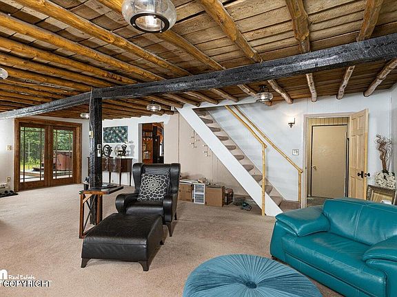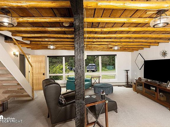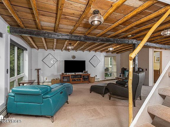 PETERS CREEK FRONTAGE! One of a kind home with a true Alaska feel! Charming wood plank, post, panel, and beam features throughout, to include the ceilings, stair handrail, and accent walls. The kitchen is beautifully updated with stainless steel appliances, tile backsplash, and solid surface countertops. There is a wood burning stove in the dining area. The deck overlooks the large, private lot.The garage has a full-size mechanic's pit built in for oil changes.