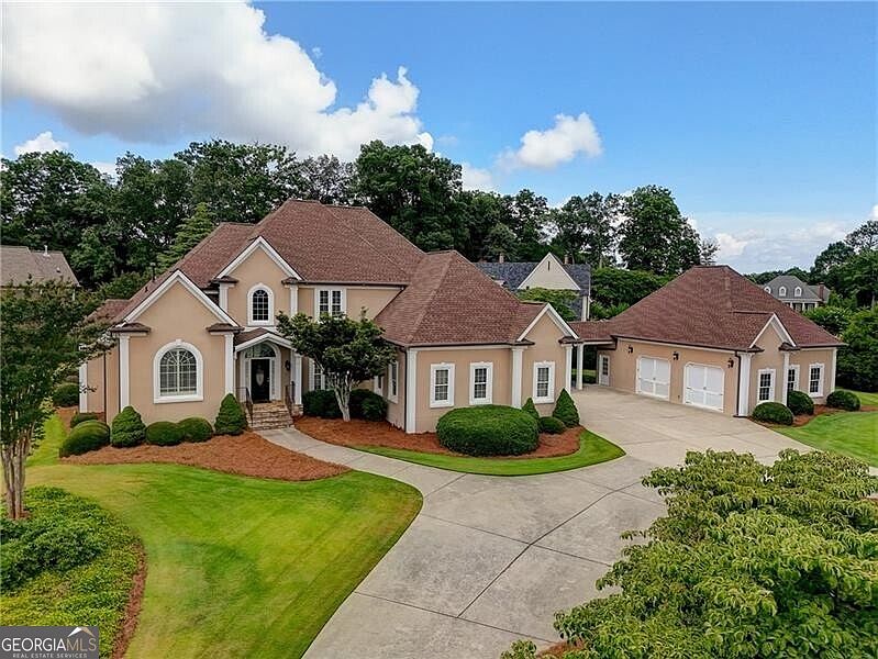 Welcome to this luxurious estate nestled within the prestigious Marietta Country Club. This stunning residence boasts a perfect blend of elegance and functionality, offering unparalleled comfort and style. Upon arrival, you're greeted with a beautifully landscaped exterior with a horseshoe driveway, offering both convenience and a touch of elegance. Step through the grand foyer into a home designed for both relaxation and entertainment. The main level features a private primary suite that grants direct access to the expansive back deck. The ensuite bathroom is very generous, inviting a spa like experience. The open floorplan offers a spacious kitchen layout that facilitates culinary creativity and adjoins a sophisticated dining area ideal for hosting intimate meals or festive celebrations. Adjacent to the primary suite, the fireside family room beckons with its warmth and charm, leading out to a covered screened porch which extends the living area making it perfect for hosting gatherings or simply to unwind. Upstairs, 3 generously sized bedrooms await, complemented by a full bath and a convenient Jack and jill bathroom. A substantial unfinished walk-in storage area provides ample space for seasonal items or personal belongings. This exceptional residence includes a dual garage setup-an attached two car garage and a detached 2.5 car garage with a finished room above. With its prime location and thoughtful design, this Marietta Country Club estate offers a rare opportunity to customize and create your ideal home, blending timeless architecture with modern comforts.