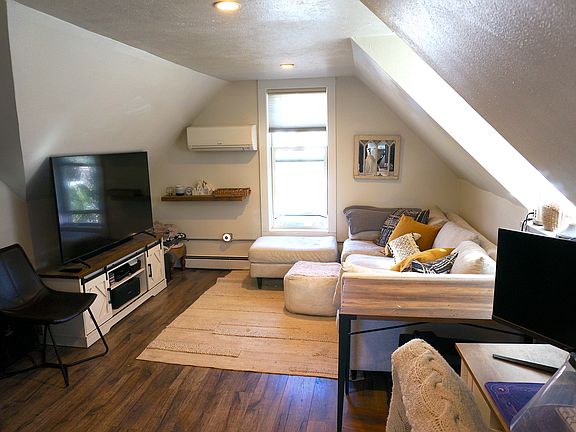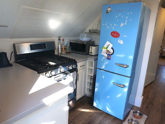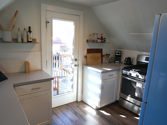 Refurbished and furnished loft like one bedroom in top floor of Victorian triplex. Excellent location in quiet residential area on Mapleton. South facing deck overlooking large back yard with ample trees and off street parking via alley access. Private access and stairway. Engineered hardwood throughout, hot water radiant heat, gas stove, stainless appliances, stone counter, mini-split AC, washer/dryer. Option to rent unfurnished. There is also a detached 100 sq.ft. studio on the property available for an additional $300/month. 1 Year. Trash, recycling and water are included in rent. Tenant responsible for gas and electric. No smoking, cat ok, 1 off street parking spot via alley access.