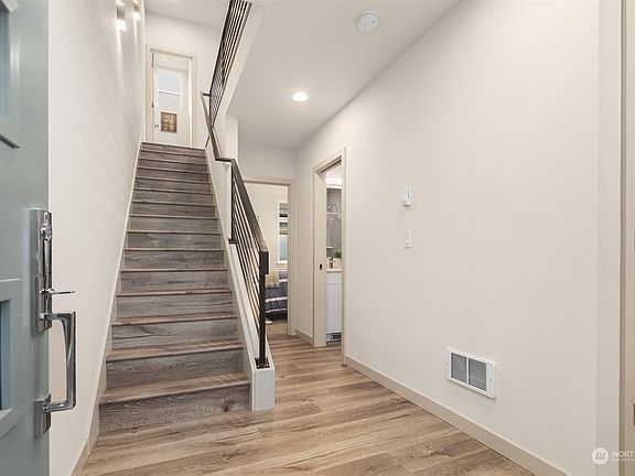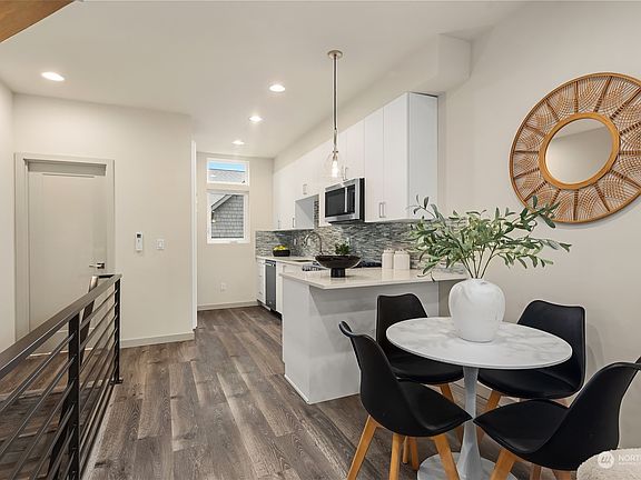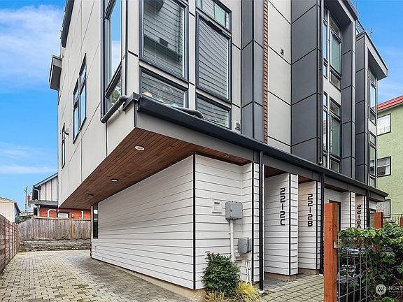 Better-than-new modern townhome tucked away in a peaceful setting yet right in the heart of Ballard. Open-concept main floor features sleek kitchen w/flat-panel white cabinetry, quartz countertops, gas range & SS appliances. Dining area flows into great room highlighted by floor-to-ceiling windows. Convenient powder room completes the main level. Ascend impressive floating staircase to sun-drenched primary suite w/2 closets & spa-inspired ¾ bath w/dual vanities. Guest bedroom, 2nd ¾ bath & utility room on lower level. Enjoy incredible views from expansive rooftop deck, ideal for entertaining w/plenty of space to relax around gas fire pit. 1 assigned parking spot included. Easy stroll to SLU & DT Seattle. Close to all the amenities. No HOA!