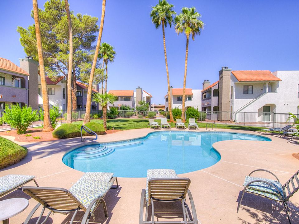Gorgeous 2nd Floor Condo Directly Overlooking the Beautiful Pool & Jacuzzi*Highly Desirable, Quiet Location at the Rear of the Community*Three Separate French Doors Open to 3 Private Balcony's * Kitchen with Stainless Steel Appliances, Granite Countertops * Master Bath has a Huge Bathtub & Skyligh t* 2nd Bathroom Enjoys Double Sinks & Granite Shower * Fabulous Location in Green Valley School District * Walk to Dozens of Shops @ Sunset & GVP Including Trader Joe's, Smith's, Public Library!