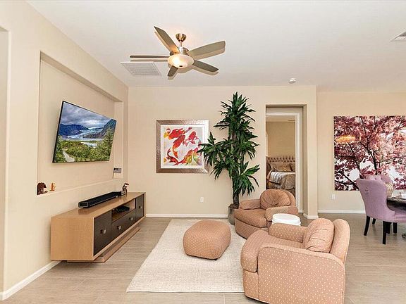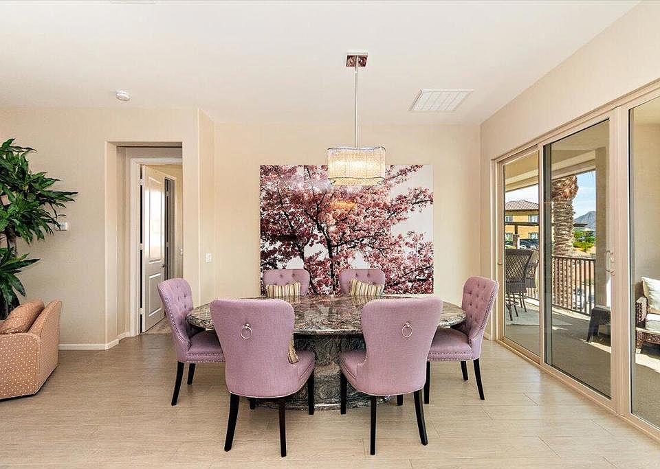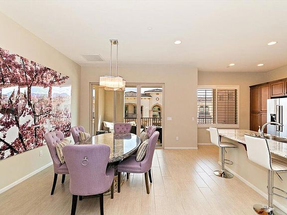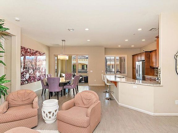 Dazzling! This 55 and over condo is located in prestigious Villa Portofina. Large 2 bedrooms and office. Two full spacious tiled bathrooms with double sinks and oversized showers, upgraded cabinetry and lighting. Kitchen with granite countertops and Kitchen Aid appliances throughout. The flooring is ceramic tile in the living area and upgraded carpet in bedrooms. Gorgeous King Size Master with custom window treatments. Fully furnished with a beautiful, Dining Chandelier, artwork, and granite dining table. Just a few of the lovely amenities . Custom window treatments throughout the home. Patio is large with a peek a boo view of the mountains along with patio dining, fire pit and BBQ. The Club House is exceptional!Amenities include but not limited to a 100 seat movie theatre, Bistro, Dining room, Billiards, Bridge Library, Conference Rooms, Bocce Ball, and beautiful Olympic pool and Spa. Solar, Gas, Trash, and Spectrum TV with high speed internet and window washing, included in HOA fee. This gem is a must see!