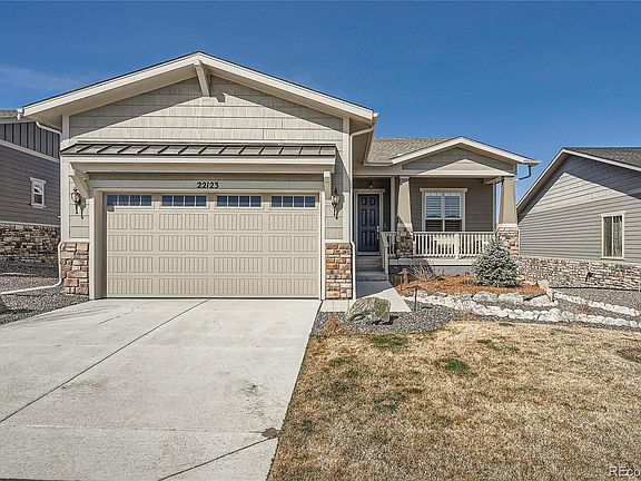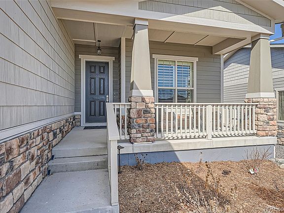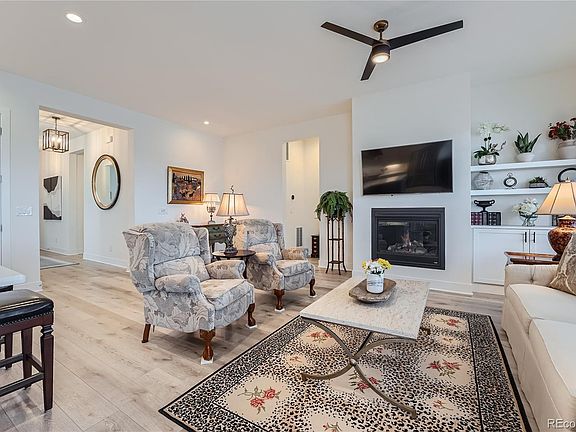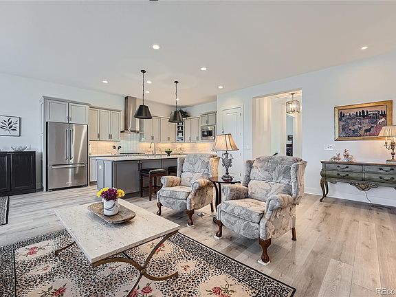 This pristine 2022 Toll Brothers ranch is in the heart of Inspiration’s coveted 55+ Hilltop neighborhood. Walk into this grand entry with wide plank flooring and beautiful lighting fixtures. Home office positioned at the front of the home along with the possiblity of 2 secondary guest bedrooms + bathroom (office conversion priced out.) Third bedroom is currently is non-conforming. Find the laundry + mudroom off the oversized 2 car garage. The gourmet kitchen has an expansive center island with storage, quartz countertops, 42 inch shaker cabinets and KitchenAid appliances. Plenty of counter seating or dine in the informal dining area. Great open floor plan offers a fantastic living space with new custom built-in shelving and gas fireplace. Primary suite is tucked away in back of the home with large bay windows, beautiful bathroom and walk-in closet. The two car extended garage has 8 ft garage door to allow parking for trucks and larger vehicles. Brand new custom window treatments installed throughout the home along with additional professional landscape competed late summer of 2023. The world is your oyster with over 1700 square foot unfinished basement space to make your own. Inspiration active adult residents gain exclusive access to the resort-style Hilltop Clubhouse featuring bocce ball courts, pickleball and tennis courts, pool, fitness center, yoga studio and an outdoor patio with remarkable mountain views. The ideal location allows easy access to E-470, is under 10 minutes to Saddle Rock Village and Southlands Mall, 20 minutes to DTC and 30 minutes to DIA.