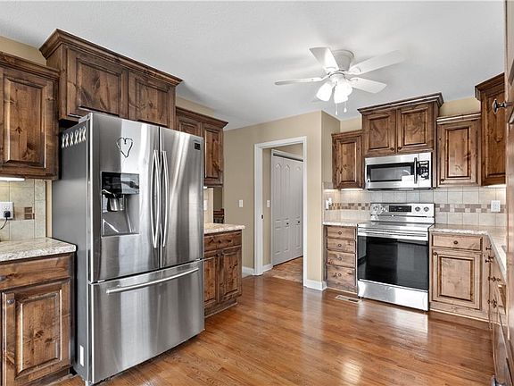 Compare to New! This ranch home offers 3 bedrooms, 2 full baths, and a spacious 3 car garage. As you enter from the covered front porch, you're greeted by a welcoming foyer that leads to a generously sized great room featuring a tray ceiling, a ceiling fan, and a charming fireplace. The kitchen and dining room boast beautiful hardwood floors, with the kitchen offering custom cabinets, stainless steel appliances, granite countertops, under cabinet lighting, and pull-out shelves in the pantry. The dining room, with lots of natural light, includes a sliding glass door opening onto the expansive deck and patio, perfect for outdoor entertaining. The first-floor laundry/mudroom provides plenty of custom cabinets and additional pantry space for your convenience. The primary ensuite bedroom features a spacious walk-in closet, double vanities, and a walk-in shower in the bath. The secondary bedrooms are generously sized with ample closet space. The walk-out lower level is equipped with built-in shelves and a sliding glass door leading to the patio. With approximately 1,650 sq ft finished on the main level, this home offers plenty of space. The oversized garage provides ample parking and storage space. This home is like new. Owner is a licensed agent in MO.