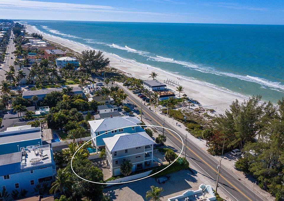One or more photo(s) has been virtually staged. STUNNING BEACH HOUSE WITH FULL GULF VIEWS!!! ONLY 10 STEPS FROM THE PROPERTY TO YOUR FEET IN THE SAND!!! ONE OF THE NICEST HOMES YOU WILL EVER FIND WITH ENDLESS GULF VIEWS IN THIS PRICE POINT! Prepare to capture breathtaking moments as you immerse yourself in the splendor of this spectacular 3-bedroom, 3-bath turnkey furnished home. Nestled just across the street from a beachfront park, the property offers UNOBSTRUCTED VIEWS that will leave you in awe. From the moment you pull into the paver brick driveway you will feel the stress of life melt away in this coastal retreat. Tropical landscaping, the sounds of the waves and endless sunsets will provide full relaxation. This ideal family vacation home boasts two spacious beachside porches, a putting green a private heated pool for your enjoyment year round. The three-story island paradise offers a great room floor plan that is perfect for entertaining. The large dining room is next to the chef's kitchen equipped with stainless steel appliances, a spacious center island with a breakfast bar and plenty of cabinet space which makes this home perfect for gatherings. The serene master bedroom offers endless views of the turquoise water, sitting area, ensuite bathroom and a private scenic porch. The second and third bedroom provide the perfect space for friends and family to visit. The refinished hardwood floors throughout add to the coastal ambiance. Explore the vibrant Bridge Street with its charming shops and restaurants, and take advantage of the nearby marina for all your boating needs. This property offers an exceptional investment opportunity, with projected rental income available upon request. Whether you choose to make this your permanent residence or an income-generating vacation home, every day will feel like a vacation as you immerse yourself in the coastal lifestyle. Don't miss the chance to own this exquisite piece of paradise in Bradenton Beach.