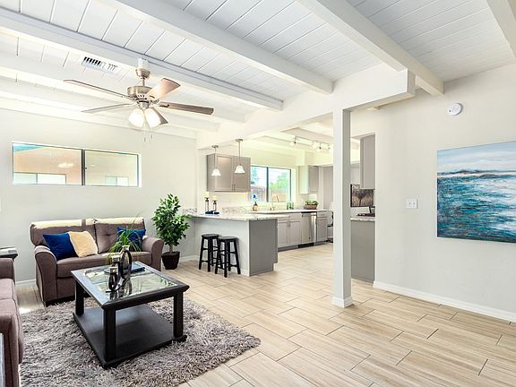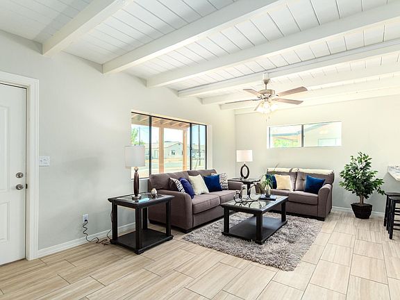 Seller will accept or counter offers $265,000-275,000. Stunning home w/great curb appeal. Handsome wood ''look'' tiled floors, white vaulted wood ceilings w/beams, soothing palette, ceiling fans, & upgraded lighting. Beautiful new kitchen features granite counters, breakfast bar, pendant lighting, SS appliances, & gray cabinetry w/stylish hardware. Formal dining area & family room for entertaining. 2 Upscale baths w/designer tile, new plush carpet/padding in all bedrooms, ample closets, & laundry room. Sparkling pool, exterior fireplace, concrete stained covered patio, & fire pit area.