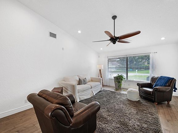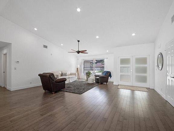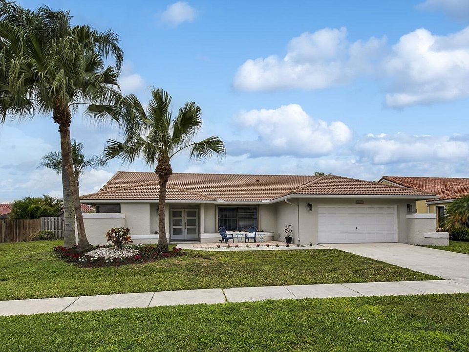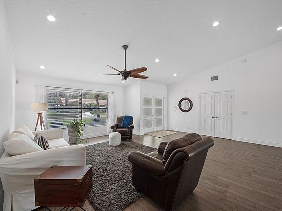 Peace and tranquility abound in this tropical paradise. From the moment you enter this 4 bedroom, 2.5 bath home you will notice vaulted ceilings and an abundance of natural light. The dream kitchen features granite countertops, marble tile backsplash, stainless steel appliances, snack bar and a breakfast nook. The main retreat includes a slider to the patio, a large walk-in closet, a soaking tub, dual sinks and a walk-in shower. Enjoy your own tropical paradise with a covered patio, custom pool, tropical landscaping and an oversized fenced yard. Neutral flooring, high hat lighting, double impact glass front doors and accordion shutters are just a few highlights of this home. Located close to shopping, dining, entertainment, A'' rated schools and major highways.