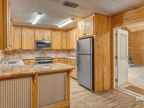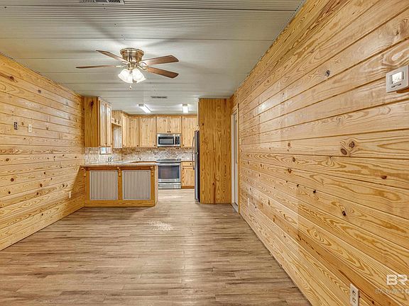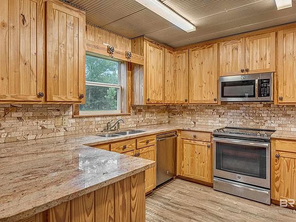 Tucked away down a private, wooded drive, this charming 4-acre country retreat offers the perfect balance of peaceful seclusion & convenient access—just 6 minutes to I-10 at Buc-ee’s, 30 minutes to Mobile, 35 minutes to Pensacola Airport, & under an hour to the white-sand beaches of Gulf Shores. At the heart of the property sits a beautifully finished barn that blends rustic charm with modern comfort. The 1BR/1BA living space features galvanized metal ceilings, pine tongue-and-groove walls, hand-crafted cabinets with granite countertops, stainless steel appliances, & a natural stone backsplash—every detail thoughtfully designed with warmth and character. The bathroom boasts a 5'8" x 3'8" tiled walk-in shower, & the cozy living area flows into a 560 sq ft shop warmed by an old-fashioned cast iron fireplace, which the sellers used to heat both shop & living quarters. Additional storage or future living space is located on a second level room in the shop. Central heat & air, city water, & modern finishes make it turnkey, while a 600 sq ft lean-to shed offers room for equipment & tools. Barn is sturdily built with steel trusses with rafters that are metal strapped, for peace of mind. Septic was installed to accommodate a 3/2, 1800 sq. ft. home, in addition to the barn living space, so bring your building plans. Altogether, you’ll enjoy 760 sq ft of living space plus all the functional space you need for hobbies, storage, or even a home-based business. The cleared apx. one-acre homesite provides open sky and room to breathe, while the surrounding 3 acres of woods create a natural buffer, ensuring privacy and quiet. Whether you're looking for a full-time homestead, weekend escape, or a place to build your dream home while living onsite, this hidden gem offers freedom, flexibility, and a life lived close to nature, while still being an easy drive to shopping, dining and entertainment. Also listed as MLS 383411. Buyer to verify all information during due diligence.
