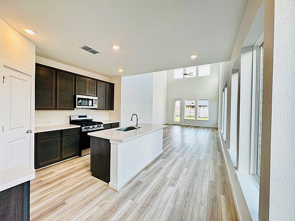New Construction, Built by Taylor Morrison in Avalon at Cypress. FRIDGE, WASHER AND DRYER INCLUDED! This modern two story Nantucket plan offers open-concept living with soaring ceilings and a spacious layout built for entertaining. The large family room flows effortlessly into the dining area and kitchen, creating a welcoming hub for gathering. The private primary suite is tucked at the back of the home and features an oversized walk-in closet and spa-like bathroom. A guest bedroom with full bath sits at the front of the home, ideal for visitors. Upstairs, you'll find two additional bedrooms, a full bathroom, and a versatile game room perfect for movie nights or casual hangouts.