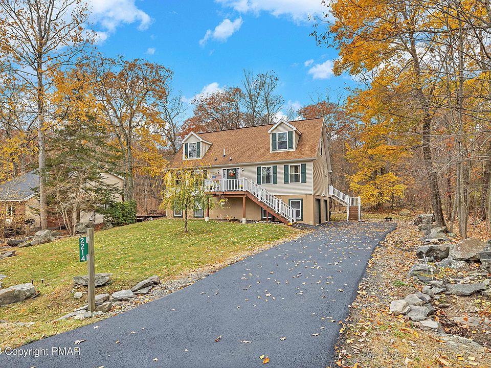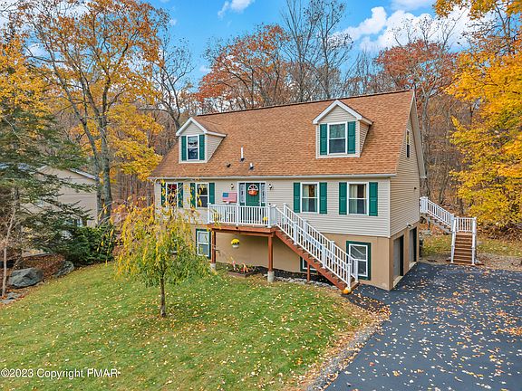 Hang your heart in this spacious cape cod style home - perfect primary residence or 2nd home. Two bedrooms on each floor, including first floor primary suite. Living room has wood floors & a brick fireplace offering cozy nights with just a click of a button. Eat-in kitchen w/an island & stainless steel appliances. You'll appreciate all seasons w/2-zone heat/AC & a whole-house generator/surge protector. Daylight basement is a blank slate to suit your specific needs, gameroom, storage, etc. 2 car garage! Maintenance-free vinyl exterior plus composite decks & railings, paved driveway & lovely curb appeal. Property backs up to community greenspace & state lands. Amenity-rich community w/on-site eatery/bar, indoor pool, tennis, fitness center, ski hill & activities for all ages/all seasons.