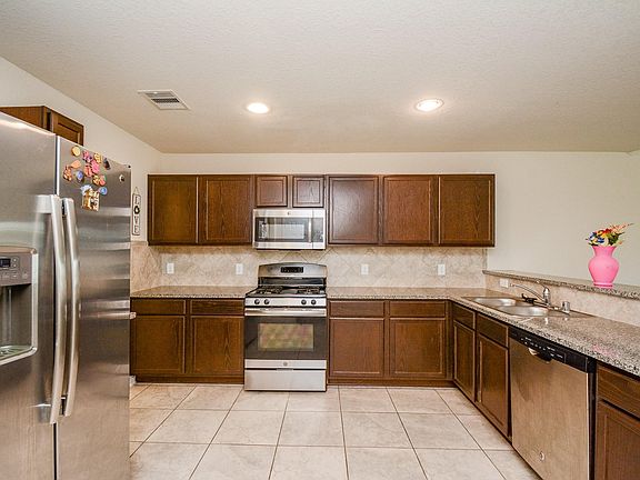 A cozy home coming which radiates natural color and light that creates a peaceful atmosphere. Kitchen features a nice backsplash, decorated with lots of counter space. A 4 bedroom, 2 and 1/2 bath, carpet and natural designed tiles. Built on a culdesac lot with 2 inbuilt car garage. It comes with all appliances needed, like microwave, water dispenser and ice maker fridge, washer and dryer, dishwasher and stove. All functional.Good location in a desirable neighborhood, comfortable layout. Fenced in and it has a covered sitting area. Ready to move in. Please pack your bags lets move and enjoy this blissful crib.
