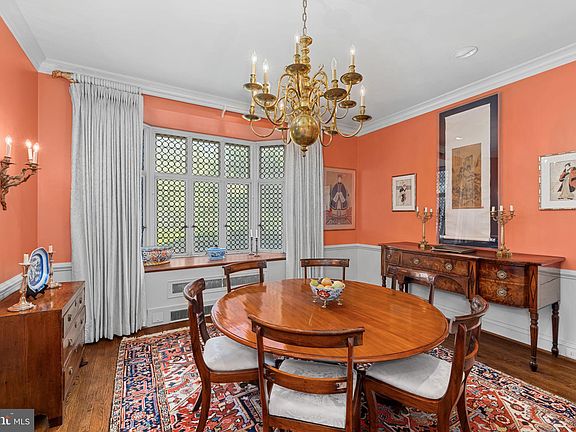 Neighborhood treasure! Spacious and bright 1931 Kalorama residence featuring grand-scale rooms, ornate architectural details, and easy driveway parking. Main level features elegant foyer with powder room and coat closet, kitchen, dining room with leaded glass windows, dramatic living room with fireplace, 12'+ ceilings, and walkout to lovely rear garden. Upstairs are four bedrooms and three full bathrooms including an expansive primary suite with fireplace, en suite bath, and dressing room. Lower level features bedroom, full bath, full kitchen, and additional storage. Romantic landscaped back garden with terrace, patio, and access to 2-car wide driveway.