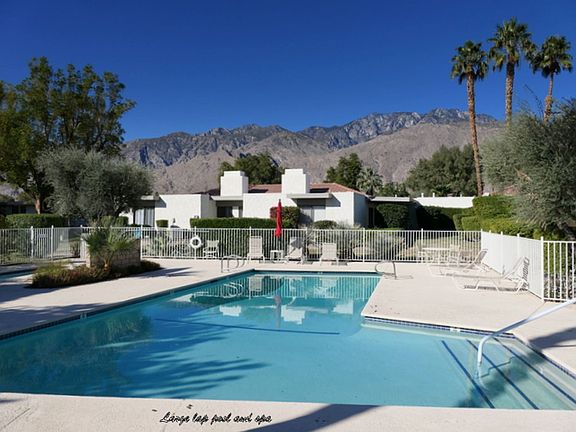 Vacation in this gated South central Palm Springs community, adjoining the Prescott Preserve, with a private access gate for quiet nature strolls! There are 4 tennis courts and 2 pickleball courts close by. Also, enjoy the pool and spa just steps from the back patio with sweeping mountain views.