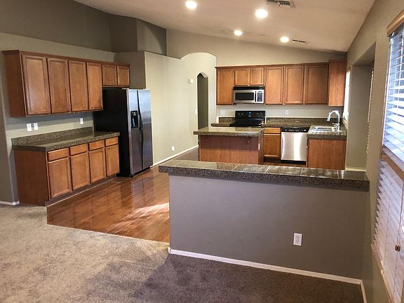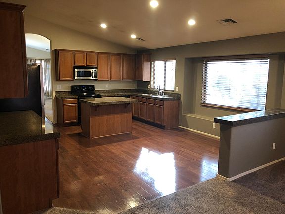 Gorgous kitchen with hardwood floors, 36 inch maple cabinets with crown molding, granite countertops and stainless appliances. All fixtures are brushed nickle on doors. Huge backyard on corner lot with tons of room to play and relax in the ramada. Auto sprinkler and drip with 4 zones, landscape lighting in front and backyard. Split floorplan with vaulted ceilings in living room, dining room, kitchen and family room. 3 car garage provides room for storage. Home is professionally painted and has ceiling fans in all bedrooms. Alarm system included.