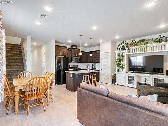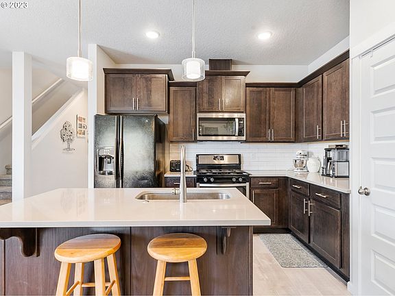 Stunning modern townhome with spacious backyard and NO HOA! Greeted by abundant natural light, this newer home features an open-concept living area with all modern amenities! Enjoy laminate flooring throughout the main level, while the kitchen boasts quartz counters with an eating bar, stainless appliances, and a sizeable pantry. Great room includes a cozy gas fireplace and slider to the backyard. Upstairs you'll find a primary suite with soaring ceilings and large windows, bathroom with double vanity, walk-in shower, and a spacious walk-in closet. Two additional bedrooms and an office space/reading nook at the top of the stairs. Make your way into the backyard where you can relax on the covered patio and rejoice in the fully fenced backyard that has plenty of room for entertaining and gardening. Near Downtown Forest Grove, restaurants, wine country, and easy access to Hwy 26!