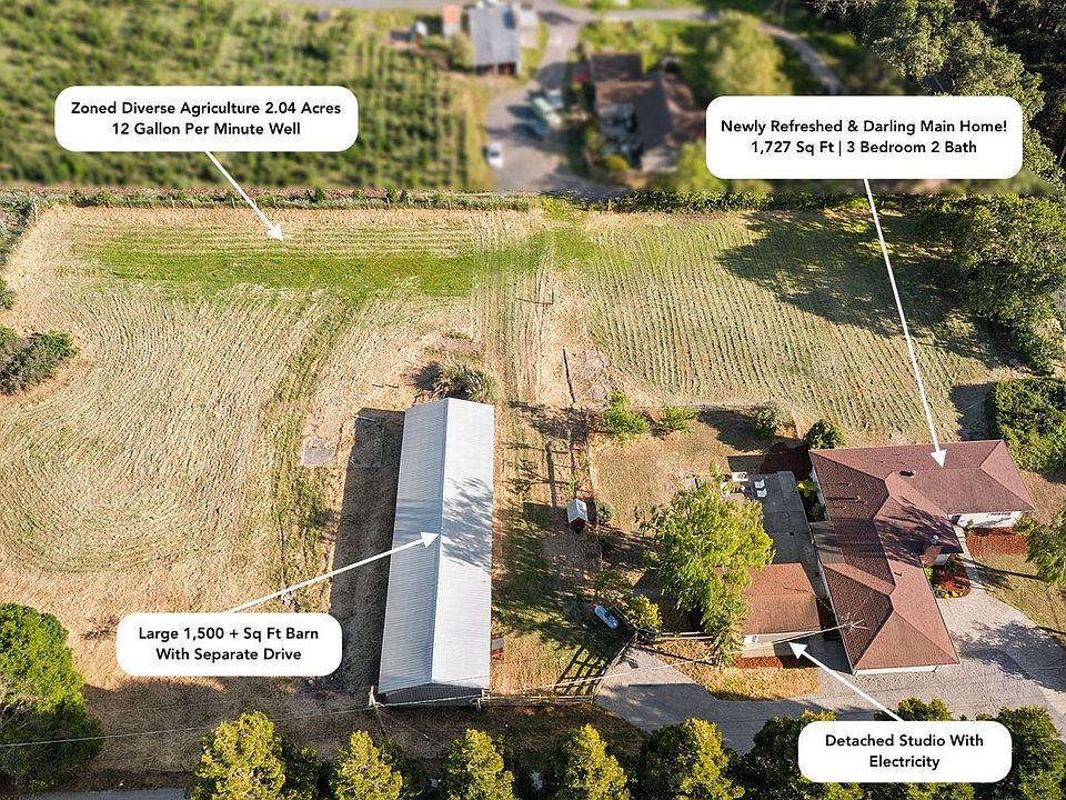 Large and usable 2 acre parcel that delivers(!) with a classic 1955 single level home, detached studio and huge, just huge barn/outbuilding. Newly refreshed and darling, the home fills with natural light in each and every room and the east/west orientation offers gorgeous sunset views over the neighboring orchards and dazzling countryside. The large country kitchen opens to the living area; quartz countertops, flooring, farmhouse stainless sink and faucet are newly installed. Hardwood floors sparkle, carpet is new & the interior has just been painted throughout. A separate detached studio with electricity is super cute with an exposed beam ceiling and painted concrete floor. And in addition, a huge, just huge barn/outbuilding with separate drive and prepped with 220V is just great for your hobby obsessions, car storage, ag needs. Diverse Agriculture zoning, there's lots of room still for your big animals, your small animals, your country dreams!