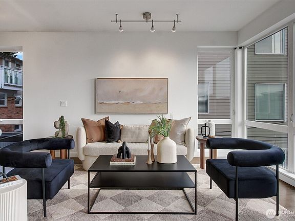This contemporary & sophisticated townhome commands breathtaking views of downtown, the Space Needle, and SLU. The graciously appointed, open-concept living areas are ideal for entertaining & flooded with natural light from the floor-to-ceiling windows. Enjoy sleek finishes throughout, incl. a gourmet kitchen featuring quartz countertops & Bertazzoni range. Eye-catching floating staircase w/ glass encasement adds a refined touch & provides effortless flow between floors. Relax in a true primary suite w/ west-facing views, ample closet space, & an attached bath. No better place to take in the fireworks or watch the sunset than the rooftop deck, complete w/ a wet bar & gas hookup. A/C, no HOA, bonus 240 sq-foot storage & off-street parking.