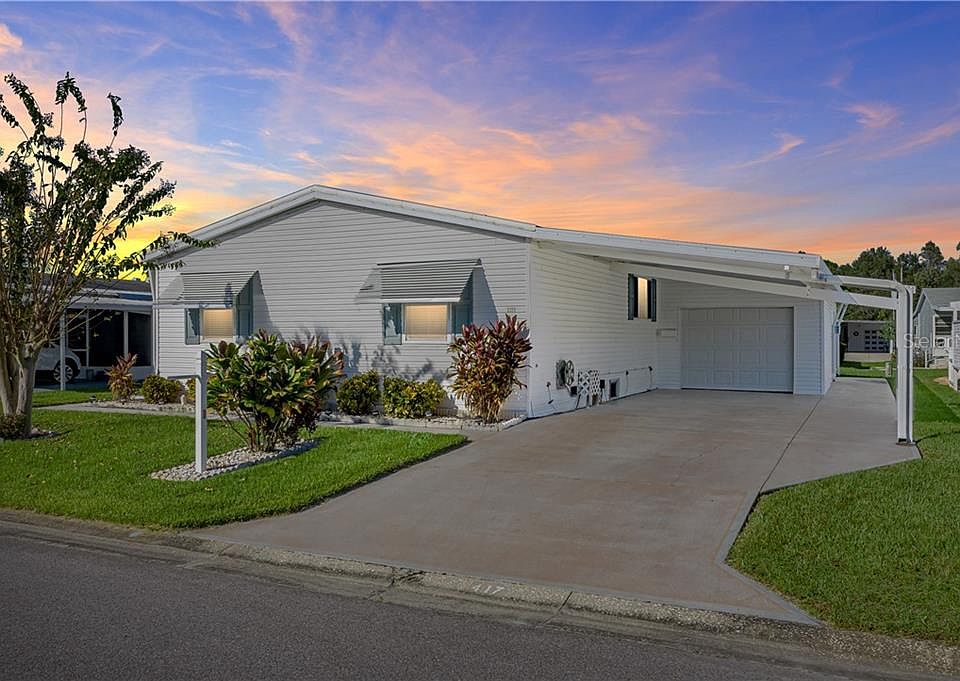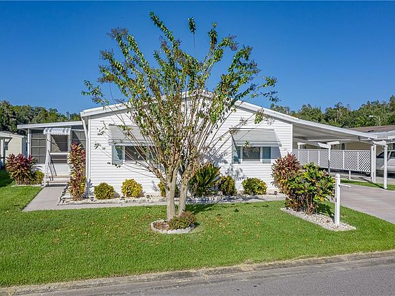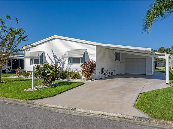 This 3 bedroom 2 bath Palm Harbor Home features split bedrooms with an open floor plan, INSIDE laundry, and eat-in kitchen space with 20 plus cabinets. The large master bedroom has a walk-in closet and master bath with a double vanity. Need a place to put your golf cart, this home has an attached storage room that will hold your golf cart with automatic garage doors at both ends, this is for easy in and out with your golf cart. You will be able to enjoy your morning coffee or afternoon beverage in the Florida room. Those who like a more active lifestyle are in for a treat, and those who want a quiet lifestyle this would be a great place. If you've never visited the community you don't know what you're missing.