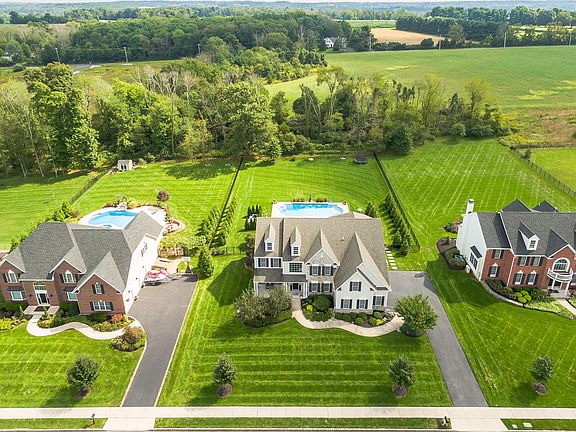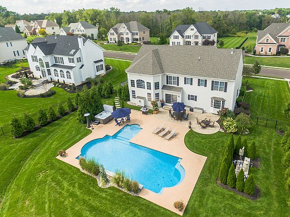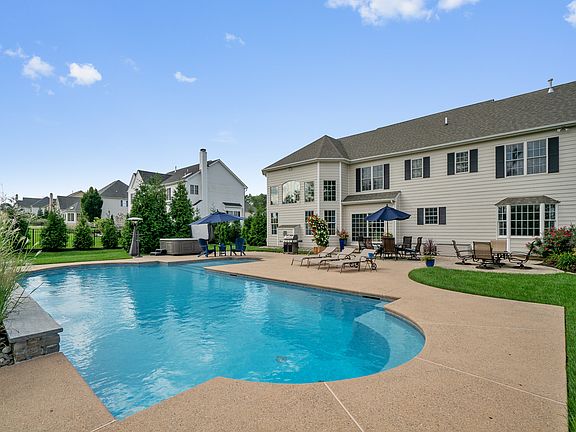 If you love the finer things in life, then you must see this elegant stone-front 4 bedroom, 4.5 bath Madison Colonial tucked away in the sought after community of the Ridings of Warwick. Get ready to experience this most amazing backyard oasis where no expense was spared. New saltwater pool with decorative raised wall and 3 lighted sheer waterfalls, LED color pool lights, tanning ledge feature and bench/swim out in the deep end. The spacious decking, lovely plantings around the pool and fenced yard create a vacation destination in your own backyard! A lovely curved staircase is the focal point of the 2-story foyer. Recently refinished hardwood flooring extends to the upgraded kitchen where the entertaining begins. Breckenridge Cherry Bordeaux cabinetry, granite counters, travertine backsplash, GE Profile upgraded stainless appliances and under cabinet lighting are a few of the highlights of this chef’s kitchen. The open floor plan flows to an amazing wall of windows (with window tinting) in the family room that take in the backyard views year-round. A second back staircase lends easy access to the second level. The living room and dining rooms are open and create ample space for large and small gatherings. A first-floor office with French doors is a private space for a home office or den. The first-floor laundry room is conveniently located off the kitchen. Upstairs the master suite has tray ceilings, plenty of room for grand furniture, a large sitting area and expanded walk in closet with custom built-in organizers. A large master bath with neutral upgraded tile, large stall shower, double sink vanity and Jacuzzi tub complete the master suite. The second floor also features a princess suite with custom built-in closet organizers and a private bath. Two additional bedrooms share a full bathroom with double sink vanity and tub shower. All closets on the second floor are walk-ins. The finished basement has a full bath, bar area with 2 beverage coolers, dishwasher and room for bar stools. A game area is set up with a pool table and separate movie theater section with built in projector and screen with surround sound for the ultimate entertaining experience. Lawn irrigation system, security system and 2-zone heating/cooling.