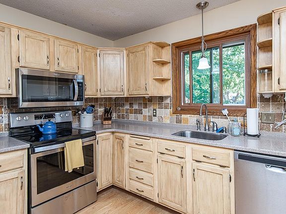 Located at the end of a cul-de-sac on a landscaped and fenced lot. Open and inviting this 4 bedroom 3 bath home offers a kitchen with a bay window, new appliances, and updated countertops and lighting. The formal dining with high ceilings bow window and laminate flooring. Enjoy the spacious living areaswith a gas fireplace in the walk-out family room and a 3 season porch off the living room area. Kick back and relax around the fire pit. Master bath offers a walk-in closer and a private 3/4 bath. The 4th level has a den area and abundance of storage. HVAC 3 years, water heater 5 years, roof 10 years, kitchen appliances 1 month. carpet updated.