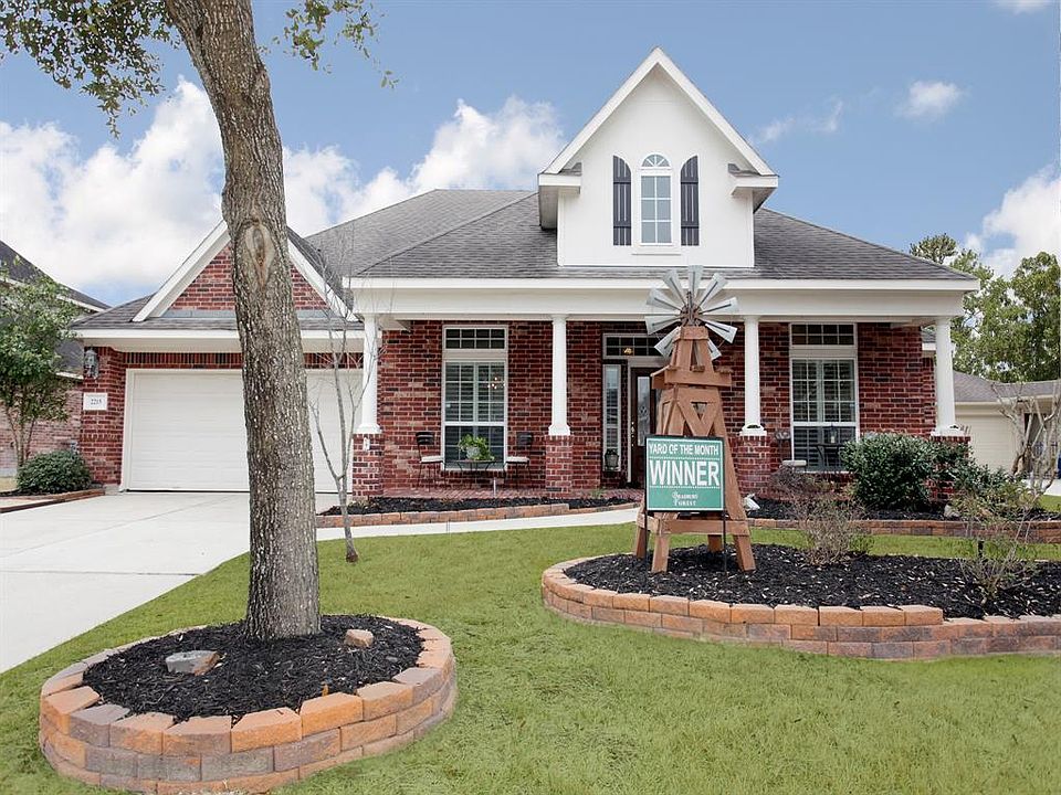 Don\'t let this gorgeous, all brick, one-story home get away. NO FLOODING HERE! Open and spacious with coffered/tray, high ceilings, arched doorways, crown molding, new carpet in all bedrooms. Each bedroom equipped with ceiling fans, new porcelain in master bath with garden bathtub, covered front/back porches with 750 SF slate patio in back with a free-standing jacuzzi tub for hours of entertainment with family and friends. Comes equipped w/Home Team Pest control System, Nutone Broan whole-house Hepa Filter system, Sprinkler system, Backyard fenced with single/double gate access, Pure Touch Aqua Filteration system and much, much more... You will love the huge 3-car garage/man cave. This home has won the yard of the month award for it\'s gorgeous landscaping and lawn upkeep. Minutes from I-45, 99 Grand Parkway, The Woodlands Mall, shopping and great dining establishments. Welcome Home!