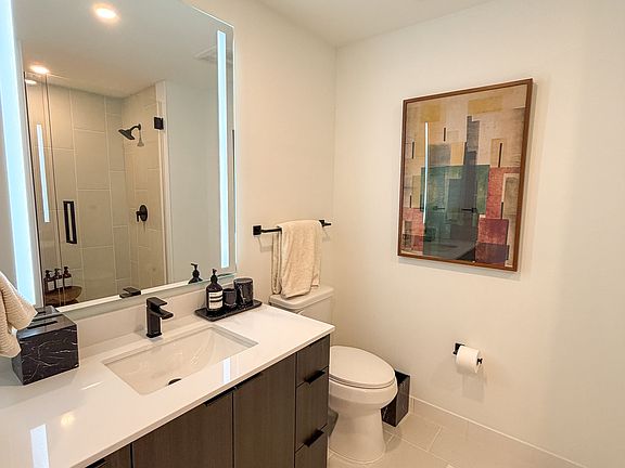 Each residence is thoughtfully designed with floor-to-ceiling windows that flood the space with natural light, smart home features for modern living, and in-unit washers and dryers for convenience. Interiors boast a neutral color palette with bold accents, custom white melamine cabinetry, and Concreta Notis quartz countertops. Select units offer private terraces, courtyard views, and higher ceiling heights on the second floor. Bathrooms are equipped with frameless glass showers, soaking tubs in select residences, and custom LED vanity mirrors.