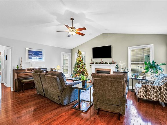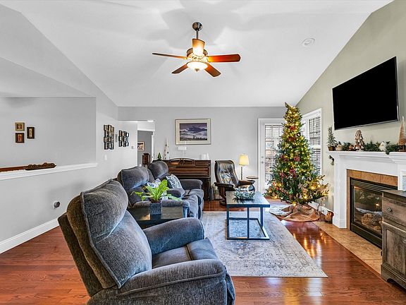 Discover the perfect blend of comfort and functionality in this beautifully designed zero-lot ranch-style home featuring three bedrooms, three bathrooms, a spacious two-car garage, and a fully finished basement. Step into an inviting open floor plan with gleaming hardwood floors throughout the living room, complete with a cozy fireplace. The eat-in kitchen boasts a large island, perfect for casual dining, and a separate dining area ideal for gatherings. The primary suite showcases vaulted ceilings, a generous walk-in closet, dual vanities, and a walk-in shower. The finished basement offers versatility and ample space, including a large storage room, a convenient office area, an additional bedroom with double closets, a full bath, and a comfortable living space complete with a kitchenette-ideal for guests or extended stays. Outside, unwind on the charming brick paver patio. There's plenty of room for a firepit and gatherings, along with a dedicated hot tub hookup for added enjoyment. This home truly has it all-style, space, and comfort. Schedule your showing today!