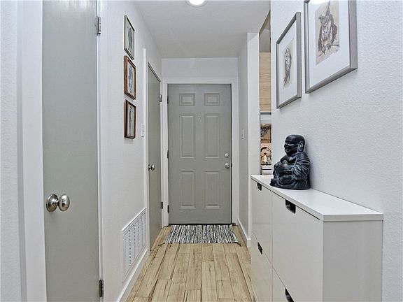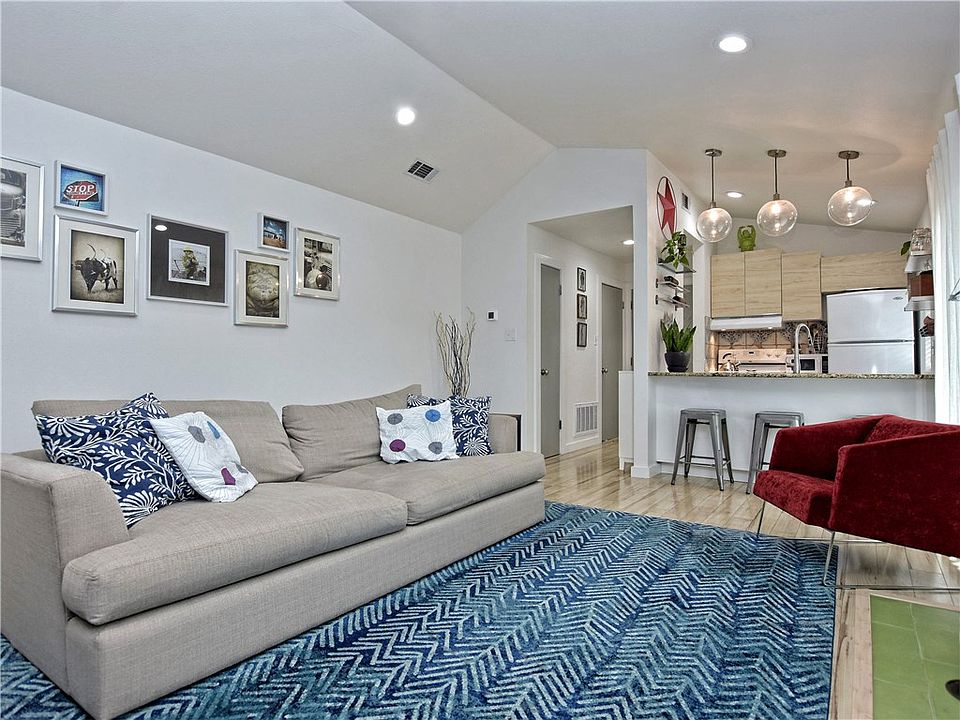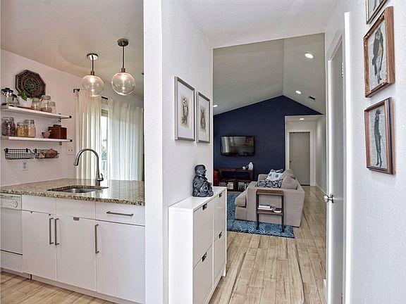 Charming open & spacious 1 bedroom & 1 bath SoCo condo.High ceilings & recessed lighting throughout. Updated kitchen with sleek modern cabinets & backsplash. Wood laminate floors throughout.Recent updated tile flooring,vanity & shelving in bath. Very clean and well maintained. Enjoy the deck with a view of the pool. Unit comes with 1 reserved covered space & storage area. Walking distance to SoCo shops & restaurants, neighborhood park & HEB. Convenient bus route to St Edwards & the University of Texas.